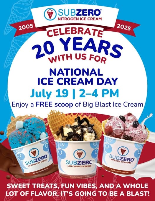 Celebrate Sub Zero’s 20th birthday with free Big Blast scoops and a little liquid nitrogen magic. Early National Ice Cream Day fun!