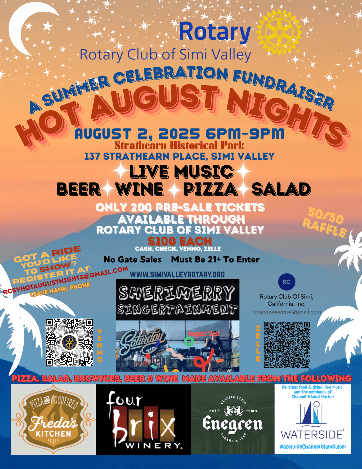 A summer celebration benefiting the Simi Valley Historical Society featuring live music, pizza, salad, brownies and a 50/50 raffle. Tickets are $100 and include wine and beer.