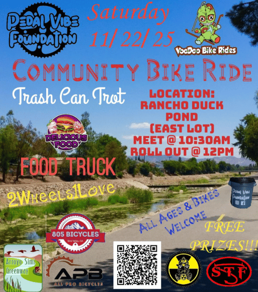 The PedalVibe Foundation is back with another community ride, the VooDoo Ride #102: Trash Can Trot, rolling out on Saturday, Nov 22 from Rancho Simi Community Park.