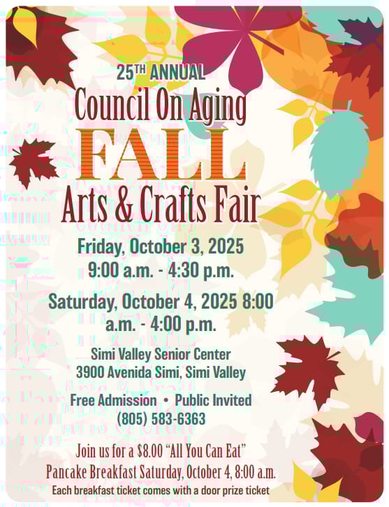 Come support local talent and enjoy a fun-filled weekend at the Simi Valley Senior Center’s Annual Arts & Crafts Fair on Friday, October 3 from 9 AM – 4:30 PM and Saturday, October 4 from 8 AM – 4:00 PM.